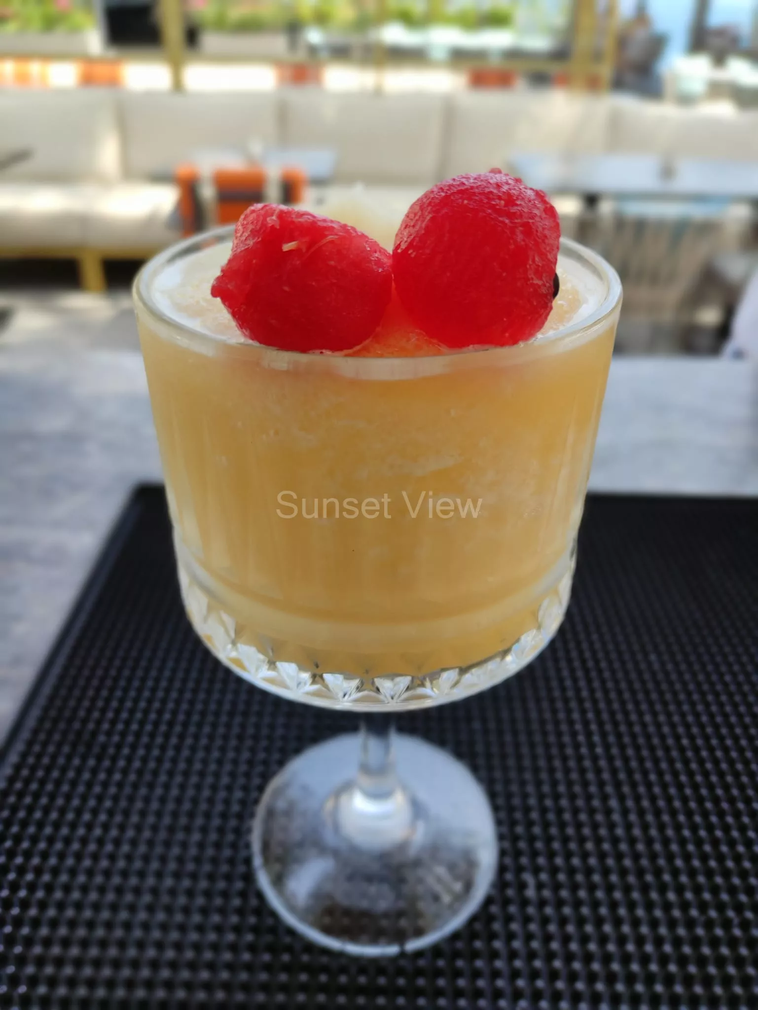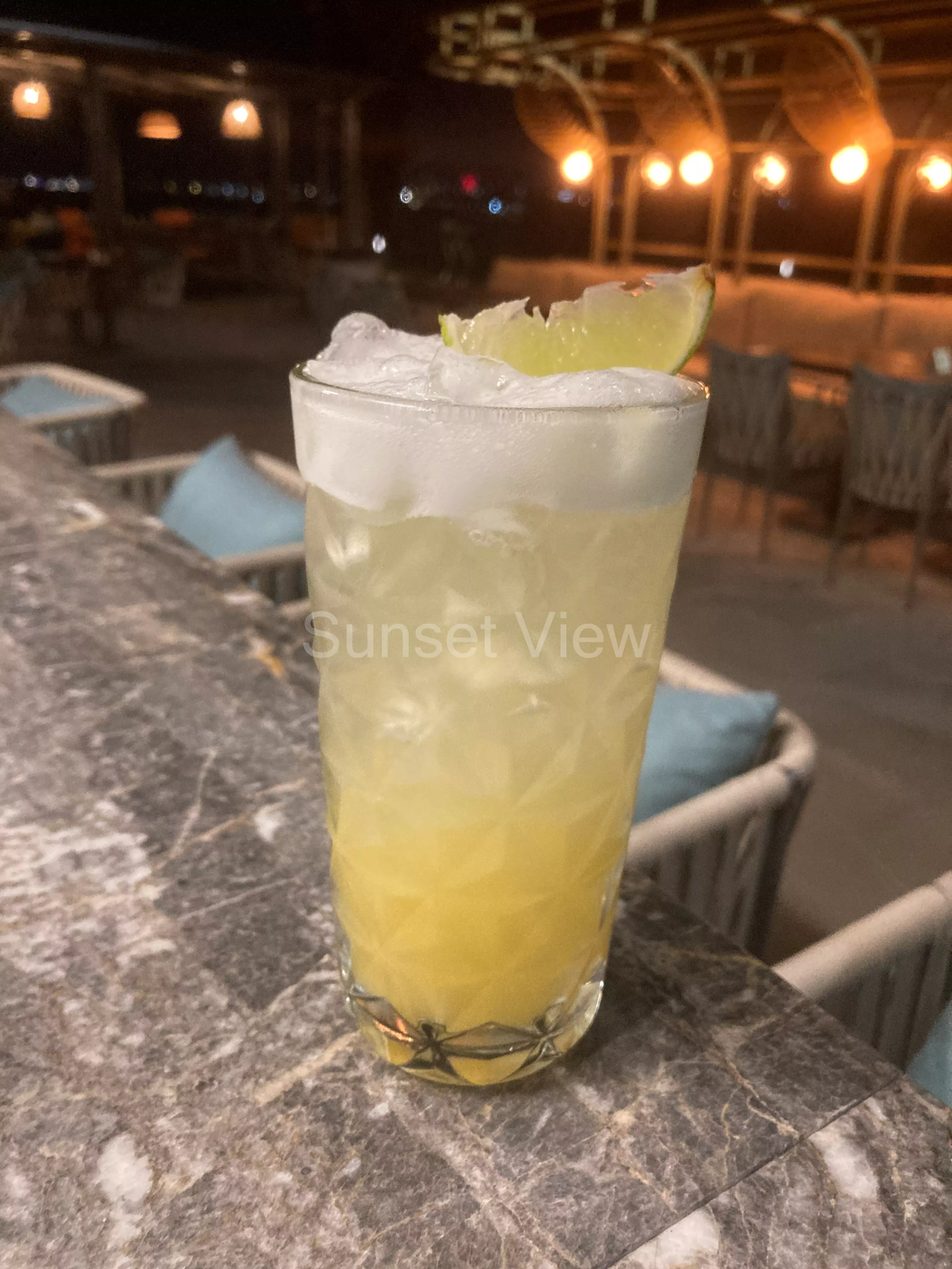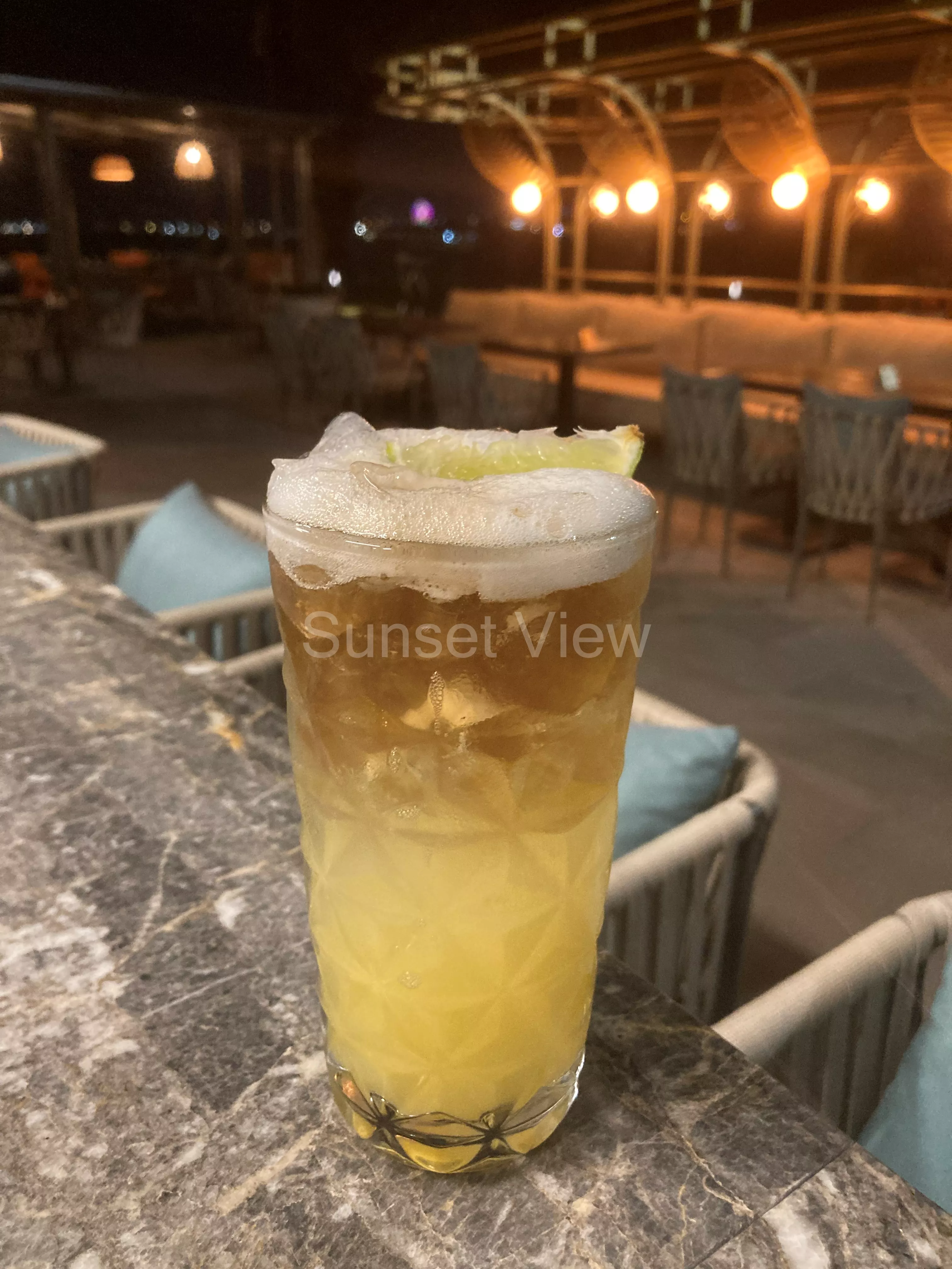 Beyaz Rom, Şili biberi, Çarkıfelek meyvesi püresi, Taze lime suyu, Sunset İmza Tatlı ekşi kokteyl Sos, Altın tozu