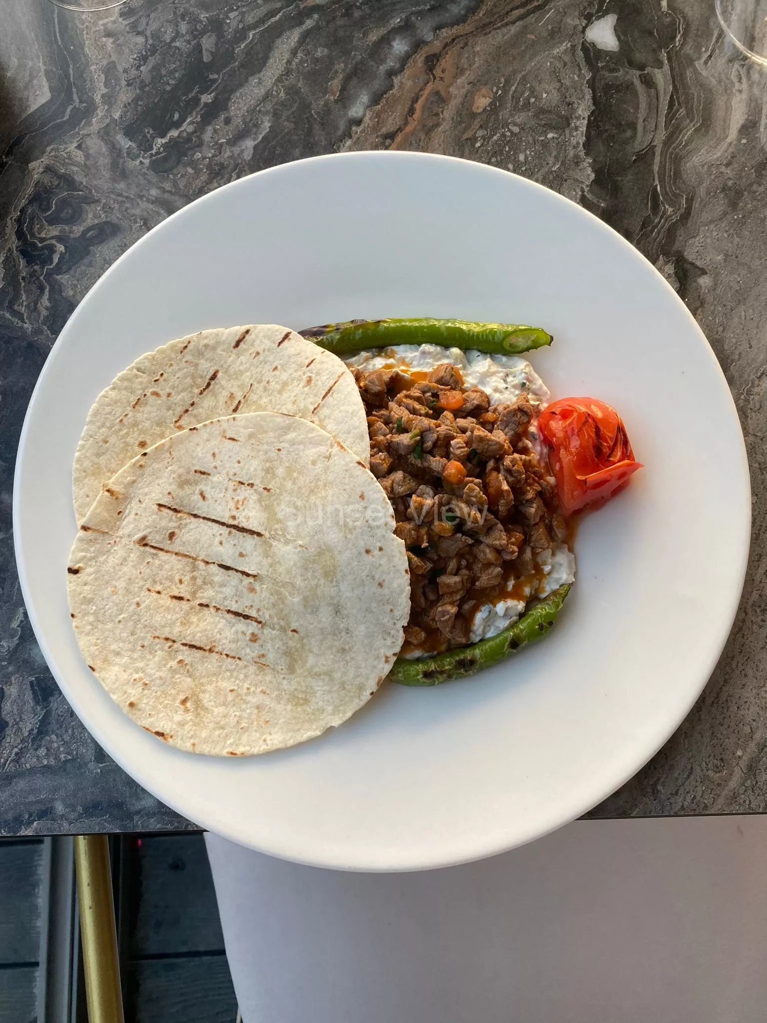 Agır Ateşte Pişirilmiş Zırh Kıyma,Közlenmiş Patlıcan,Yogurt,Izgara Domates ve Biber