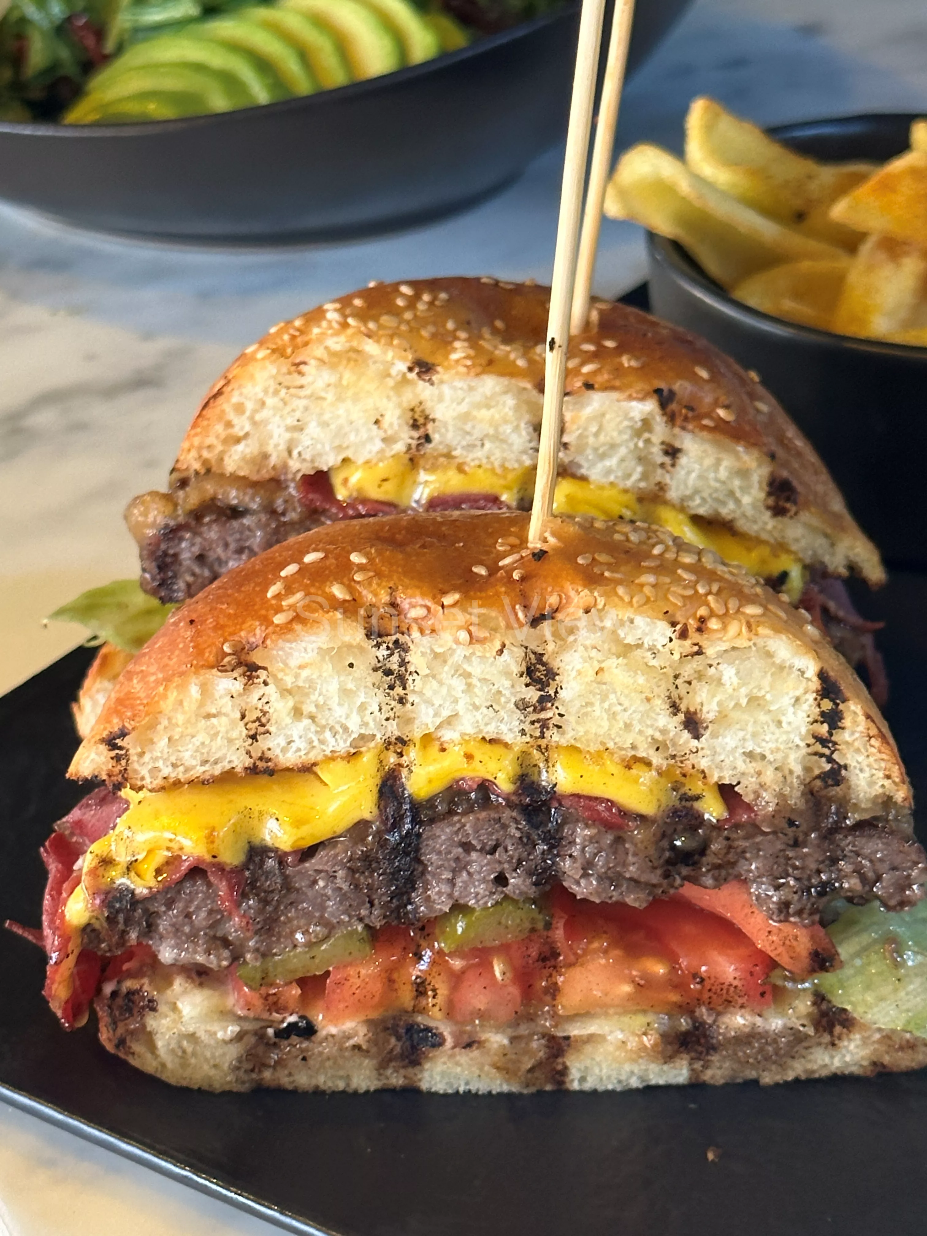 Ev Yapımı Hamburger köftesi | Dana Füme | Karamelize Soğan | Cheddar Peyniri | Ev Yapımı Baharatlı Patates Kızartması